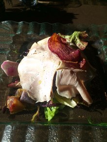 はじめは山梨の放牧豚をハムにしたものが乗ったサラダ。