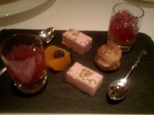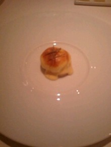 2009-12-2323:54:52ル・ジュー・ドゥ・ラシェットテーマ:グルメメルヴェイユやヌーベルエールでもいつも大満足。グループの一端を担うお店にハズレがあるわけなし!と楽しむ気持ちマックスで訪れたル・ジュー・ドゥ・ラシェット。http://www.augoutdujour-group.com/la/index.htmlクリスマス気分のテーブルオブジェでお迎えされ期待も膨らむ一方です。まずは季節のシャンパンで乾杯。アミューズの前に出てくるパンはグループどこでもそうですが塩バターと普通のバターが添えられていて焼きたてパリパリの美味パン。つい食べ過ぎちゃう。同じパンなのに飽きがこないのが不思議。今回は量が入らない私が7品の11500円のコースと相方は10品の15000円コースでオーダー。まずは共通のアミューズ。ブリオッシュ卵グラタン仕立て豚肉のムルソー。エダムチーズのスティックと赤ピーマンのフィナンシェあおさチップスとまだいのふわふわ(名前失念)。この白いふわふわが甘くなくてちゃんとした前菜でビックリ。お次は萩産河豚のカルパッチョ だいだいとシブレットのヴィネグレットです。ふぐにチョコっとソースをつけると美味しいのです。私は一回休み。相方には45℃で火を入れた鯖のコンフィ 秋茄子のクーリ ホワイトバルサミコのジュレ。この鯖、すごくクセがなくて、でも鯖の風味たっぷり。味見させてもらったのですがワインにあうあう!スープ?と思いきや鱈の白子のムニエル パセリとレモンの香り 白子のフラン 温かい甲殻類のコンソメジュレというネーミングで登場。白子が・・・甲殻類が・・・あぁなんて幸せなスープなんでしょう。(食べたらやっぱり茶碗蒸し風高級スープです)大好きなフォアグラ。フォアグラその日のスタイルで・・・ということでテリーヌ風になっていました。四角く囲っているソースが2種類あってこれまたどちらで食べてもGood。残念ながら私はまたお休み。冬野菜料理 その日のスタイルで・・・。確かに冬野菜がいっぱい。さっぱりしていて口直しによさそう。(やっぱり味見させてもらっております)魚 その日のスタイルで・・・。はコースによって違うものでした。スープ仕立てのものが15000円コースのもの。冬のお魚という感じですね。11500円はイカ墨で覆われた面白い作り。とってもクリーミー。今回は強めの白ワインで最後まで通しましたが全く問題ありませんでした。本来は11500円コースは蝦夷鹿のローストなのですが追加料金で変更。“マダムビュルゴー”シャラン産鴨胸肉のロースト 柚子風味のソースガストリック。やっぱりシャラン産鴨を食べないとね〜。おなかはつまみ食いのせいもあって?品数を減らした甲斐なくいっぱいいっぱい。でも、この真っ赤な身なのに長時間火入れをしている鴨は絶対食べるべし!ソースも甘さと柚子風味がたまりません。至福。デセール一品目。薔薇のアイス ライチのリキュール“ディタ”のジュレとフランボワーズ。お皿が目の前を通った瞬間!!!薔薇!!!ほんとに薔薇!!!という香りが立ち込めます。こんなに小さいのに、香りが強いのに嫌味のない愛らしい味のアイスでした。お次のデセールはチョコレートメイン。ガトーマンダリンナポレオン ココナッツ風味 マダガスカル産チョコレートのグラス。やっぱりデザートは別腹のようです(笑)チョコレートはちょっとパスしたいなぁという相方に変えてくださったのはモンブラン!え?モンブランにできたの?だったら私も〜と言いたいのは山々でしたが出てくるまで分からなかったのでやむなし。もちろん味見ばっちり。待望のモンブランは味見でも満足でした。ふぅ、もう入らない!チョコレートのデザートにはどうしてもコーヒーだなとドリンクを選択したものの紅茶も捨てがたい・・・と散々飲み物で迷っていた私にご好意でもう一杯と紅茶を入れてくださいました。ファーストフラッシュの紅茶は香りがとっても良かったです。さらに小菓子。これまた種類豊富、でも完食。ゼリーにムースにチョコに・・・堪能です。チェックを済ませた私たちをシェフがお見送りしてくださってお土産もいただきました。焼き菓子です。ラップでくるんであって手作り感ありあり。そして、今回サービスについてくださったのがなんと、メルヴェイユでもお世話になっていた方でどうも半年ほど前にグループ内異動されていたそうです。そして、わたしのことも記憶に残っていたそうで最後はその話でちょっと盛り上がってしまいました。些細なことですが、特にオーダー以上に会話をしたつもりがないのに覚えてもらえているってなんとなく嬉しい気持ちになりました。グループにハズレなしの予想は今回も期待を裏切らずまたまたファン心は満足。当面このグループからは離れられそうにありません。