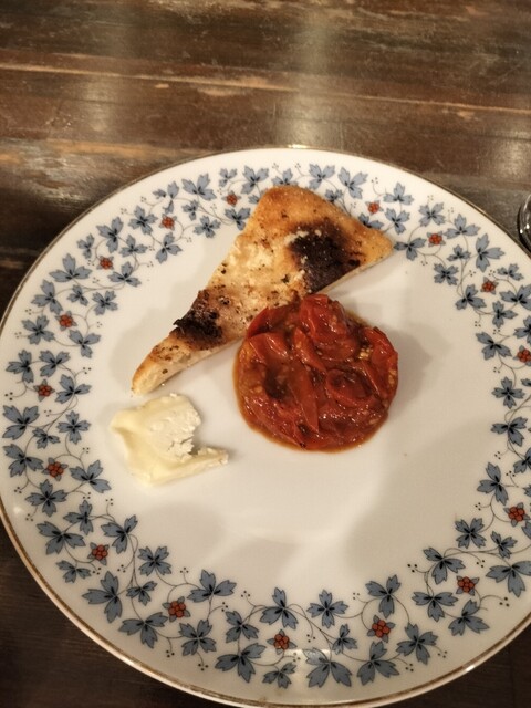 4)トマトのサラダとピザ生地のようなパン。チーズ。パンに乗せて自分でマルゲリータにします