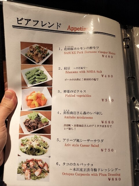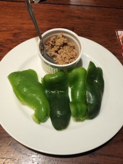 東北の肉厚ピーマン、酢もつ、と遠野のZUMONAのヴァイツェンのトールサイズで2000円弱。