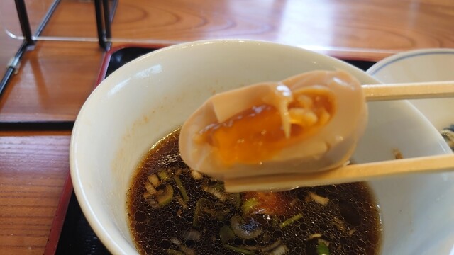 それに味玉の完成度も高い。黄身の凝固具合は、店主が狙いすました通りに仕上がってると思う。味の浸透加減も良い。黄金色とはこの色と思わせる色に仕上がっている。ご推察の通り箸だけでつかんで口に運ぼうとすると、やわらかすぎて途中で崩壊してしまうことは必至。それほどやわらかく仕上がっている。メンマに関しては固めのしゃくしゃくしたのが好みなのに対し、やややわらかめなので特筆することはないが、味付けは程よくこれも計算されつくしたものだろう。味変アイテムとして生姜や卓上にお酢などもあったが、今日はデフォで味わっているうちに麺もなくなってしまったので使用せず。