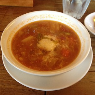 そしてスープ。ここは具だくさんのミネストローネがでるんだった!トマト味