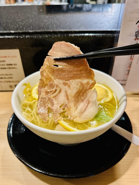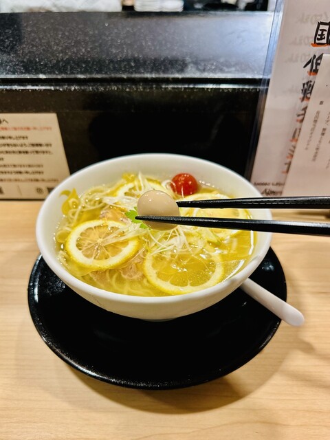 まずはスープから〜美味しい!鶏出汁と昆布に爽やかなレモン風味が素晴らしい♡スタッフさんから「瀬戸内レモン」も一緒に食されて下さい!と案内があったように試してみると「美味しいね」酸味だけでない美味しさが瀬戸内レモンにあります〜麺は加水高めな細麺でスープともマッチして美味しい!トッピングは、大判チャーシュー、鶏ハム、うずら卵 トマト 白ネギと計算された脇役が良い仕事をします!鶏ハムはしっとり!チャーシューは大判で食べ応えありと、最後の最後まで完飲完食♡満足いく一杯でした。