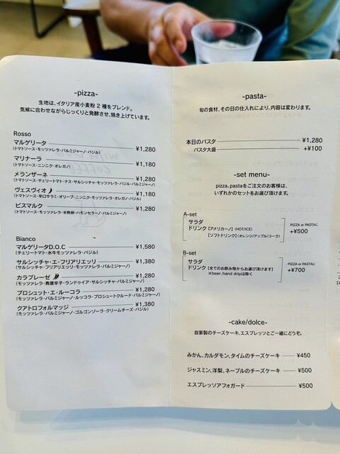 外観は一軒家! 店内では、カウンター席とテーブル席とあり!愛犬と一緒に店内で寛ぎながら食事を楽しむことができる!また、スタッフさんの、愛犬への気遣いや配慮が素晴らしく、ゆったりとした時間を過ごすことができます〜メニューは、窯で焼く本格ピザとパスタに、デザート&コーヒーなどあり!頂いたのは「マルゲリータ」と「本日のパスタ」です。