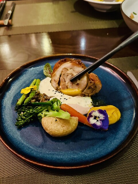 メインに選んだ料理は素晴らしかった♡「地元のスパイスでガランティンチキンの詰め物」は、伝統的なガランティン料理をスペシャルにアレンジされ美味しい☆シャルドネとマリアージュを楽しむ♡最後は「ブラックブラウンソースを添えたラムラックのグリル」は、絶妙な焼き加減にアッパレ!ナイフを入れると美し断面が現れます〜肉汁滴るラム肉は臭みもなく最高に美味しかった。