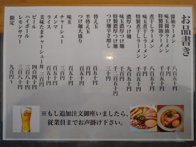 家内が濃厚な魚介系や濃厚煮干しが苦手なため、『醤油らぁ麺』、『鯵煮干しそば』、昼夜各20食限定の『濃厚魚介豚骨つけ麺』、更に数量限定の『美味たまチャーシュー丼』を注文し、家内が食べられるものを食べてもらうことにしました。