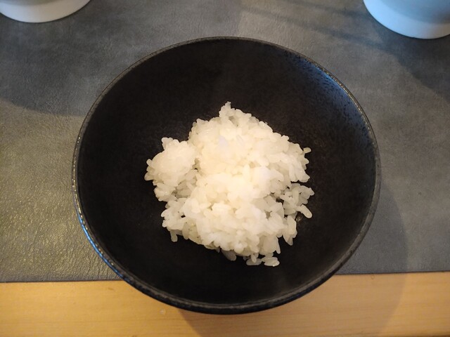 『混ぜ蕎麦4弾仕込み』はトリュフオイルが入るみたいですけど、言われなければ気付かないかもしれないくらい、優しめの味わいでした。トリュフオイルはともかくとして、美味しいまぜそばでした。最後は付いてきた1口ライスをダイブさせていただきました(^_^)v