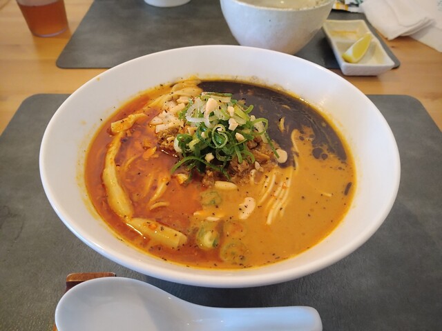 つけ麺とまぜそばが平打ちの太麺だったのに対して、この担々麺はまるで博多豚骨のような(あるいは鳴龍のような)細麺でした。この細麺がめっちゃ合っていました。めっちゃウマかったです!但し家内はティムットが苦手だったようで、この担々麺は自分が多めにいただきました。