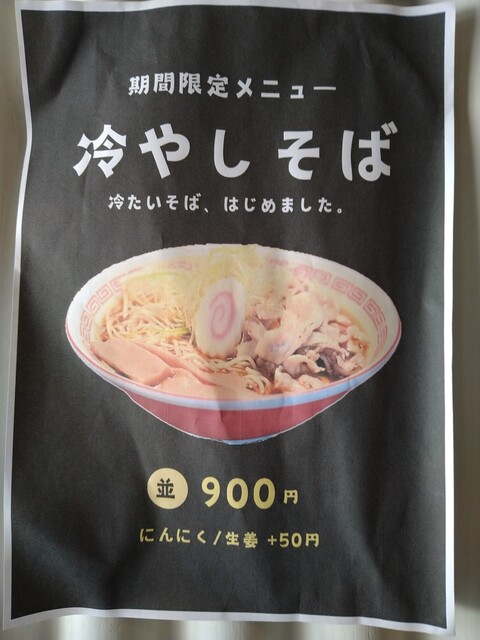 でも今回また気になる新メニューが発売されました。それが『冷やしそば』です。麺もスープも冷たいラーメンですけど、自分はこれが大好きなのに、近隣には(シンプルな醤油味のが)全くありません。スープを冷やすのが面倒だと思うので仕方ないですよね(汗)