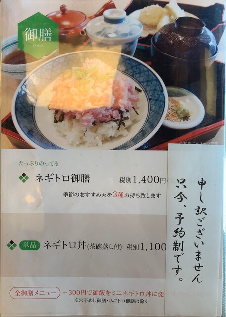 各御膳の本日の天ぷら内容は以下に