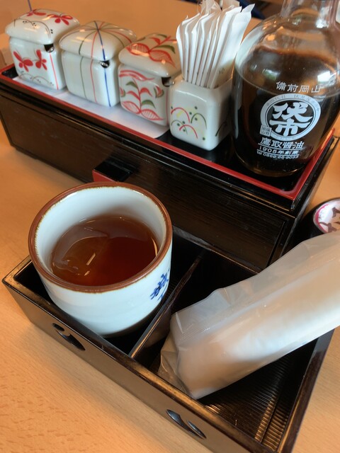 お茶とおしぼり 奥:天ぷら用のお塩など