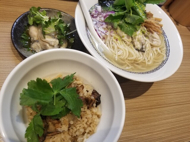 牡蠣煮干ゆずみつば+牡蠣炊き込みご飯+生牡蠣