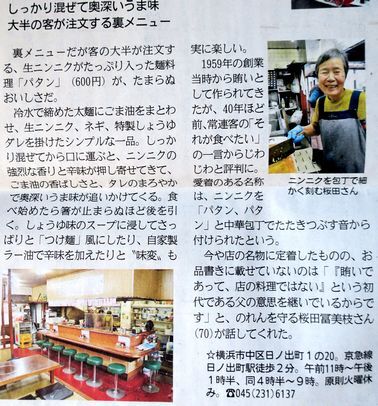 その中に、ここ「第一亭」の「パタン」(600円)も取り上げられたそうで、さっそくその朝刊を見せてくれた。