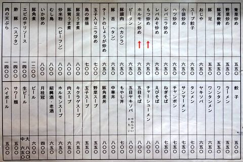 チート(豚胃)のしょうが炒め(650円)、レバニラ炒め(650円)、豚足(550円)、豚耳軟骨(550円)、子袋炒め(650円)、ハツ炒め(650円)、レバみそ炒め(650円)、もつ炒め(650円)、ホルモン炒め(650円)などなどの豚モツ類に、炒米粉(ビーフン)(800円)、五目ヤキソバ(800円)、パターン(600円)などの、つまみにもなる麺類。