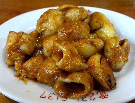 「チートのしょうが炒め」で中瓶ビールを飲み切って、「老酒(ラオチュウ)」(650円)を燗でもらうとともに、「豚耳軟骨」(550円)を注文した。
