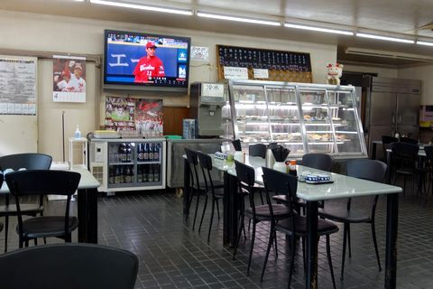 「森田食堂」やお食事処「寿」と同じく、ここ「くわだ食堂」も、冷蔵陳列ケースに並ぶ約40種類のおかず(100~400円)の中から、自分の好きなものを取ってくる仕組み。