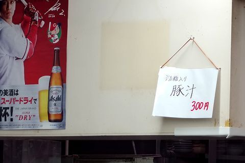店主と久しぶりに言葉を交わしながら、麦焼酎の2杯目をおかわり。お供には「酒粕入り豚汁」(300円)を追加注文。
