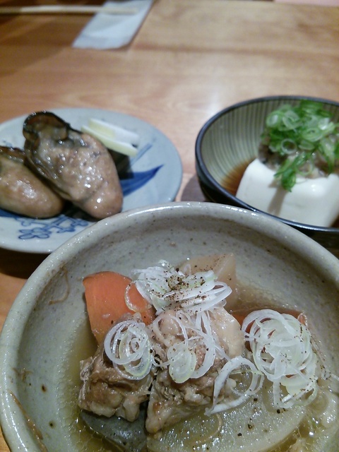 自家製牡蠣燻製。スジ野菜煮込み。麹漬けこのしろ奴