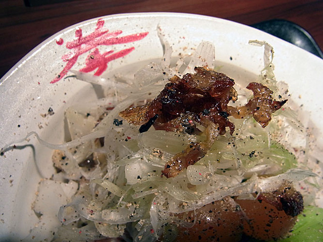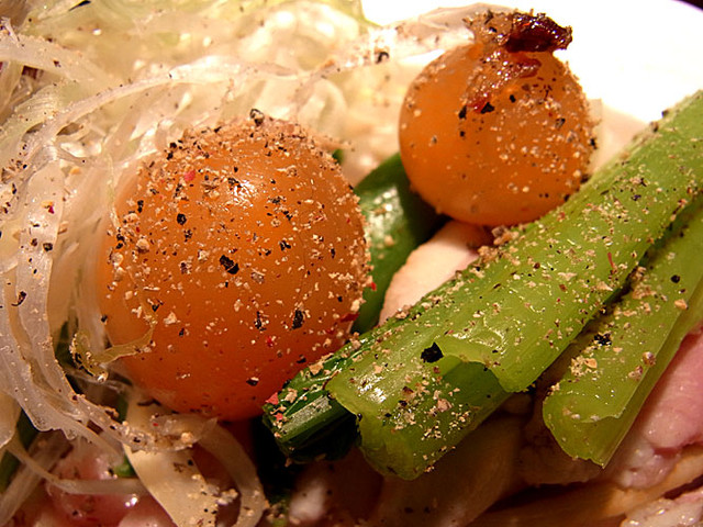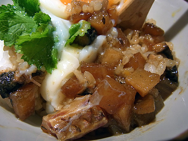 「最初はそのまま食べて、途中から卵を絡めて食べてください」ってこと。