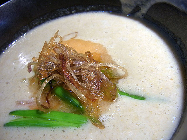 スープは昆布と水のみで、おぼろ昆布の旨味含ませたオイルが浮いています。