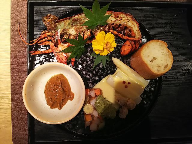 ローストしたオマール海老の半身に小鉢に入れられた味変用のスパイシーソース!