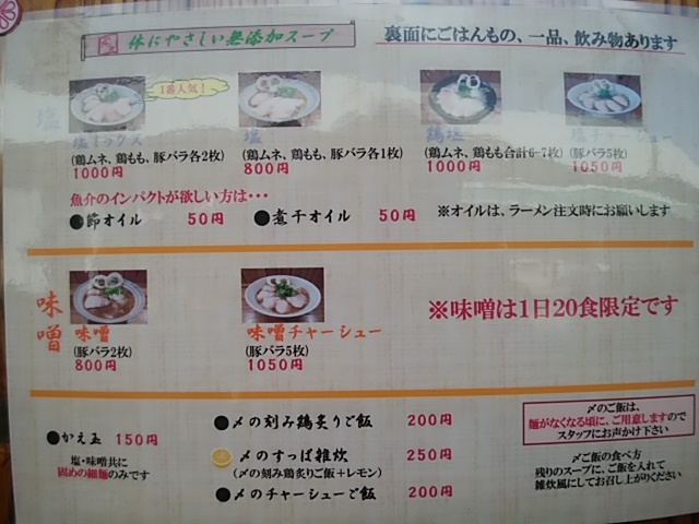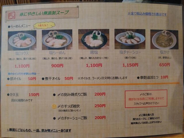 塩ミックス…1400円/塩らーめん…1100円/鶏塩…1350円/塩チャーシュー…1500円/塩かけ…800円