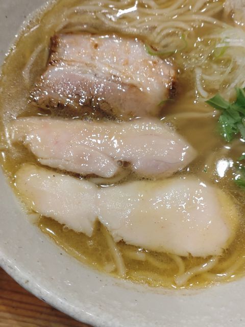 デフォルトの「塩らーめん」には鶏ムネ、鶏もも、豚バラの3種類のチャーシューがついてきて!