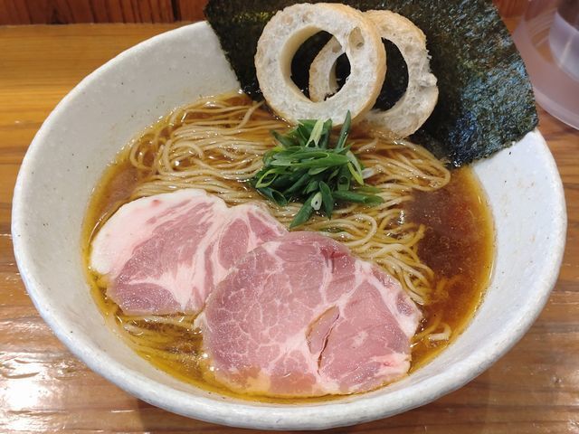 海苔2枚に青ネギと『和海』のトレードマークである車麩が2個添えられたシンプルながら美しいビジュアルのの醤油ラーメン✨️
