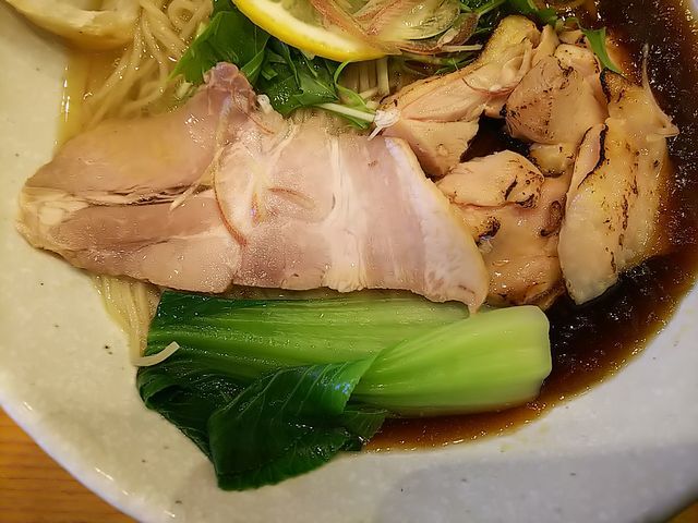 トッピングされた鶏ムネ肉のレアチャーシューは、やわらかくて、しっとりとした食感に仕上げられていて…
