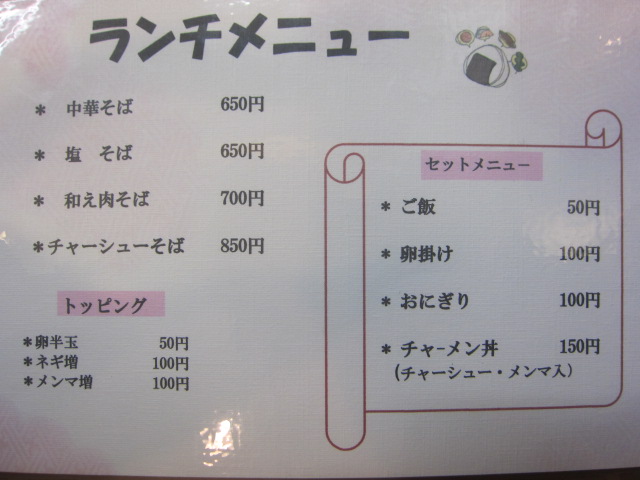 メニュー:中華そば…650円/塩そば…650円/和え肉そば(汁無し)…700円/チャーシューそば…850円