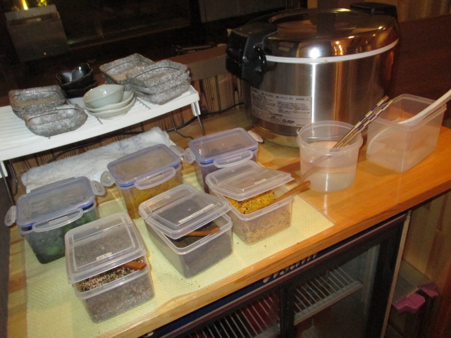 入口近くのスペースに、漬けものと炊飯器が置いてあって、ライスが無料でお代わり自由って!?