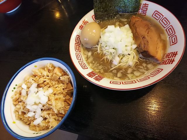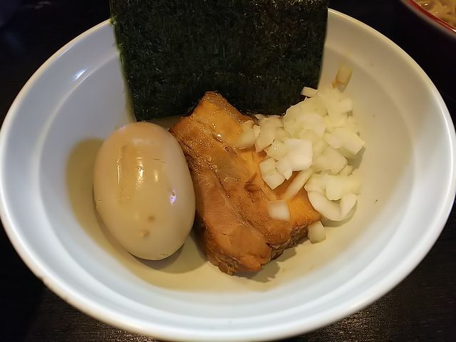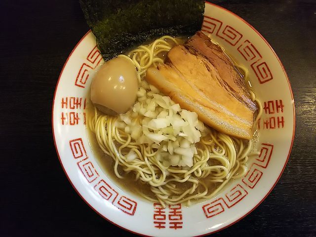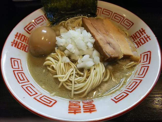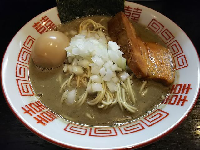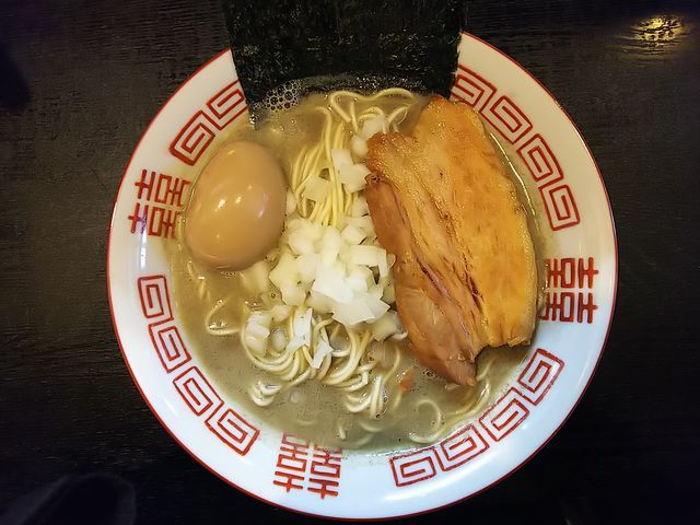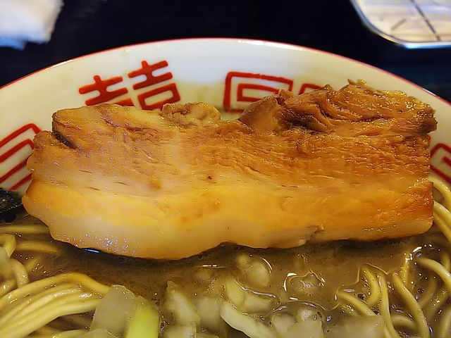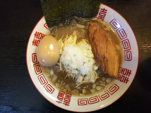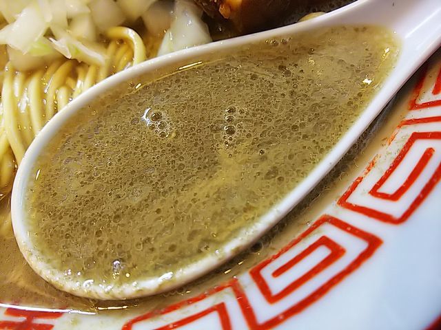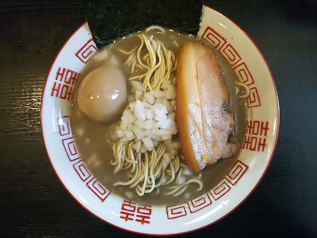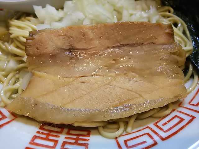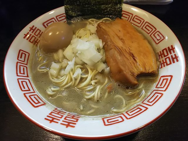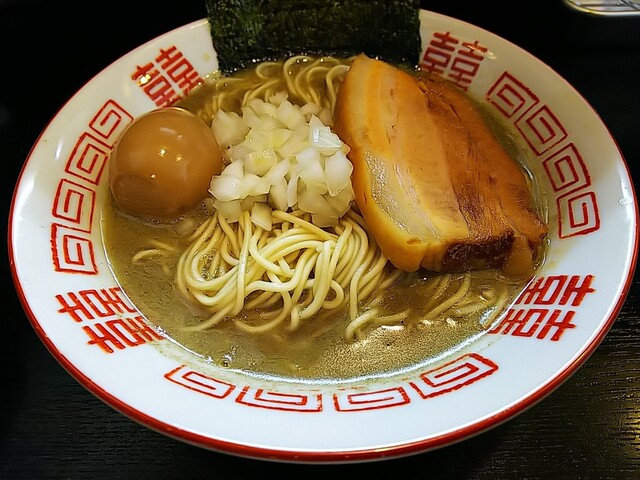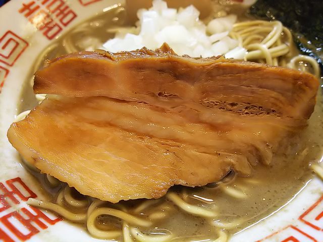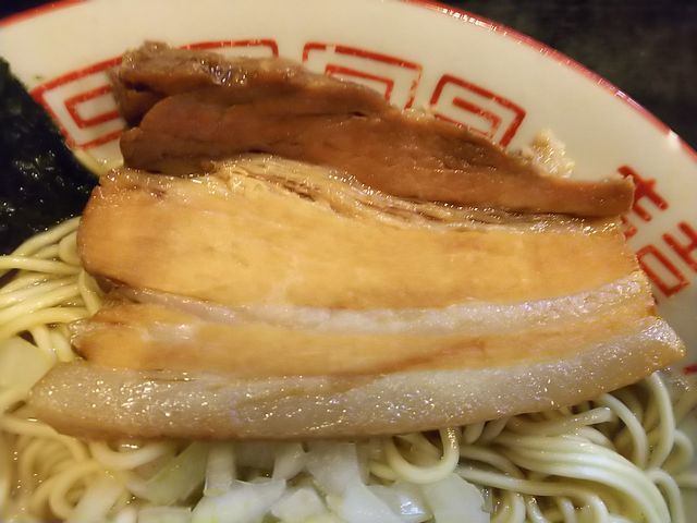 いつものように、分厚く切られた豚バラ肉の煮豚にトッピングした味玉、刻み玉ねぎが載る地味な装いのラーメン