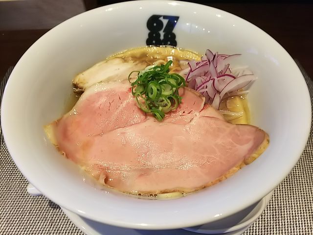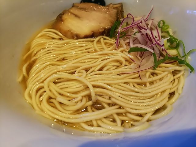 こちらも、大判の豚ロース肉のレアチャーシューに鶏ムネ肉のレアチャーシュー、穂先メンマ、スライスしたアーリーレッド(紫玉ねぎ)、小口切りされた九条ネギがトッピングされた美しいビジュアルのラーメンで♪