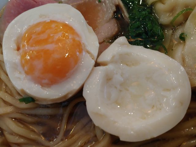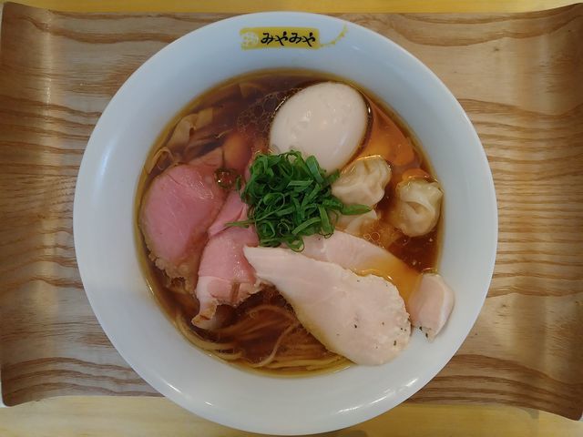 ワンタン3個と味玉、穂先メンマ、青ネギが載る流行りのネオクラシックな醤油ラーメンといったビジュアルのラーメン!