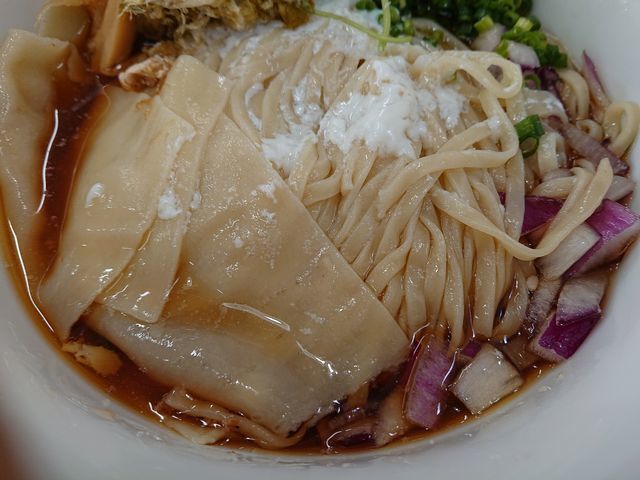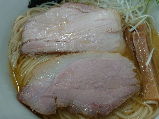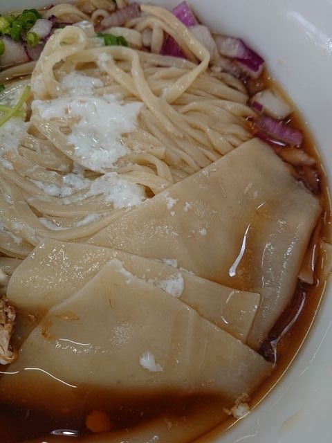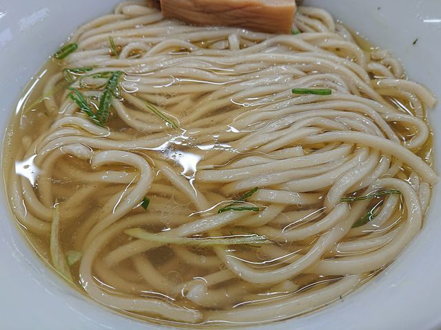 麺は、「醤油らぁ麺」、「塩らぁ麺」に使用されている太くもなく細くもない中庸な太さの切刃20番だと思われる中庸な太さの麺が兼用されていて…
