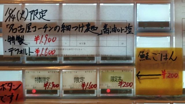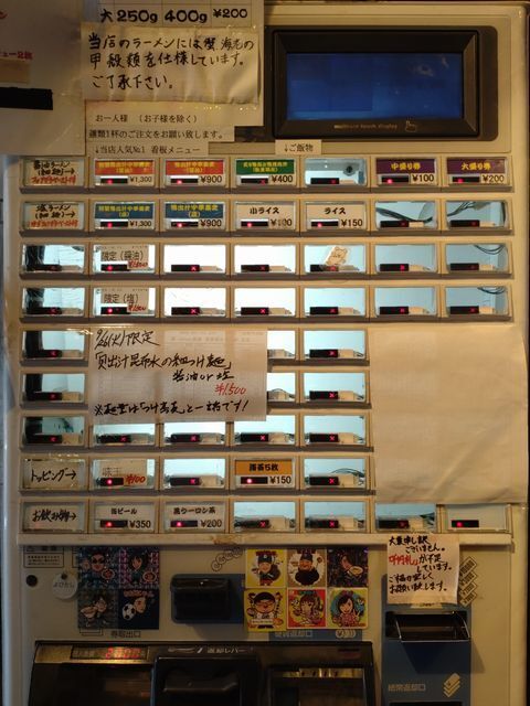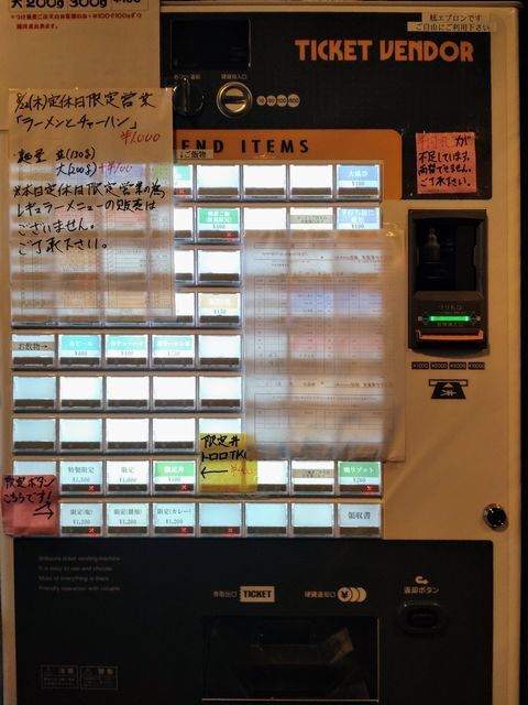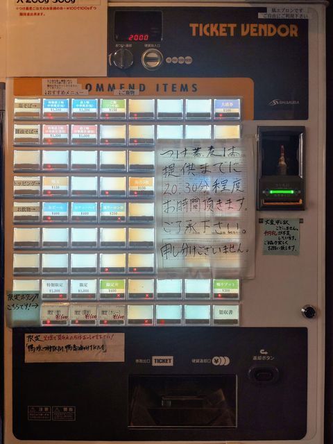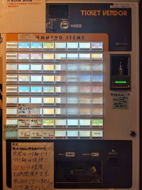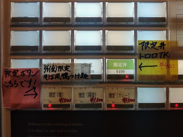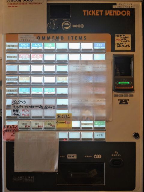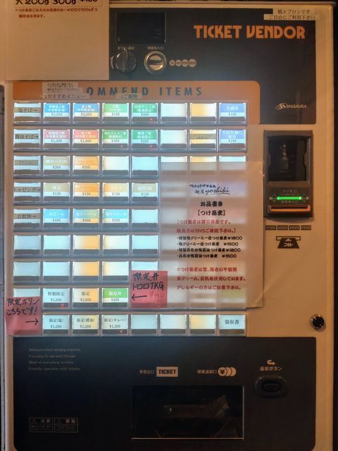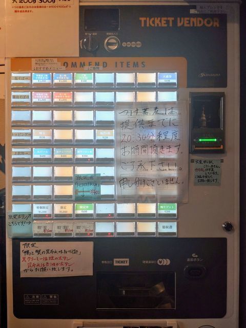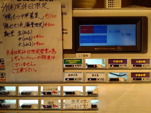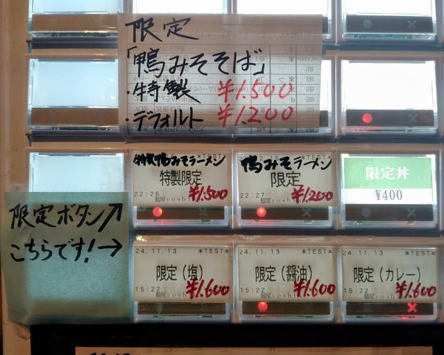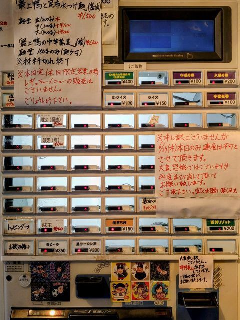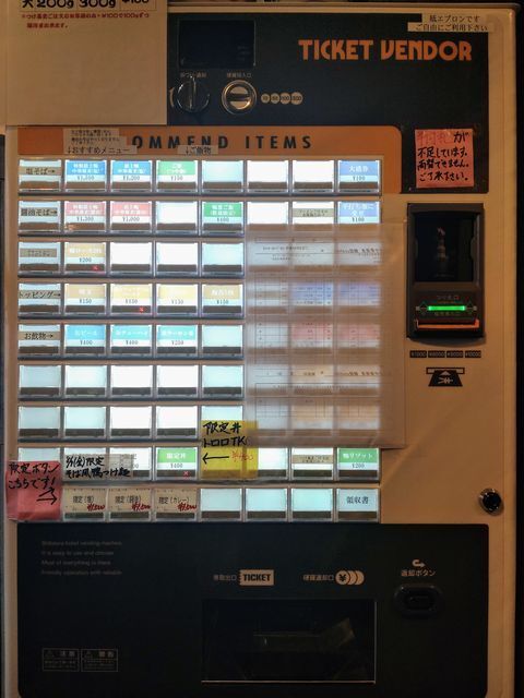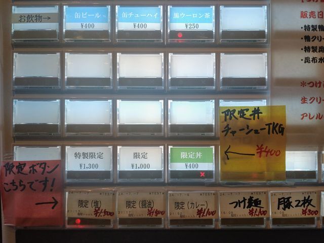 券売機で「特製鴨みそラーメン」と手書きされたボタンと「ご飯」のボタンをプッシュして食券を買って!