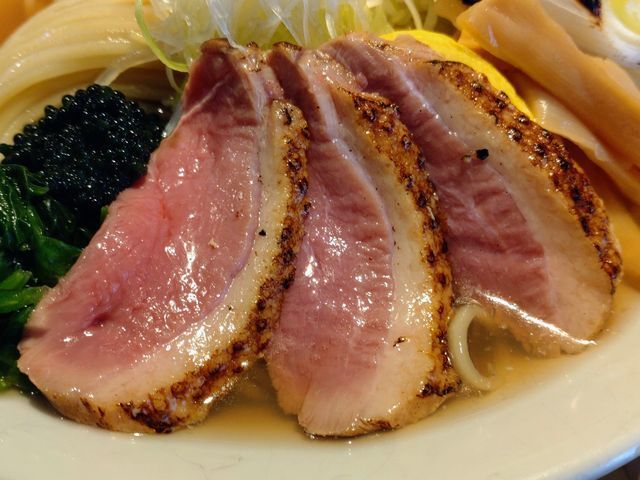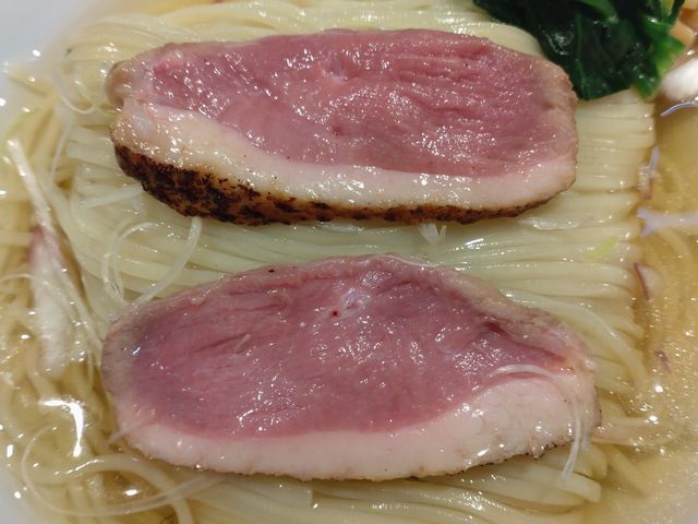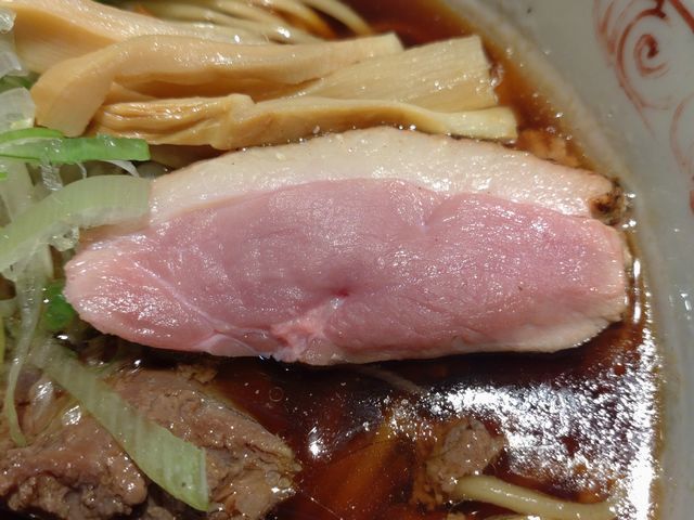 ロゼカラーした鴨ロースのレアチャーシューは、まず、火入れが完璧