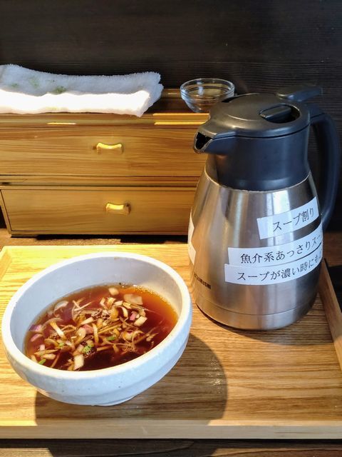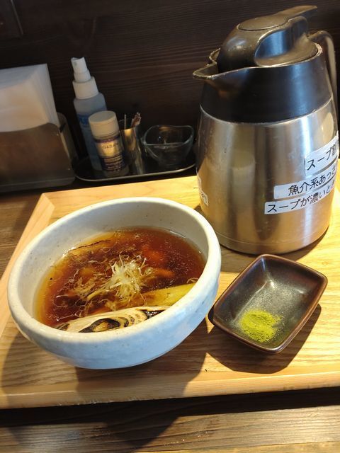 まず、卓上に置いてあるポットから割りスープをカレー味のつけ出汁に注いで、スープ割りを作って♪