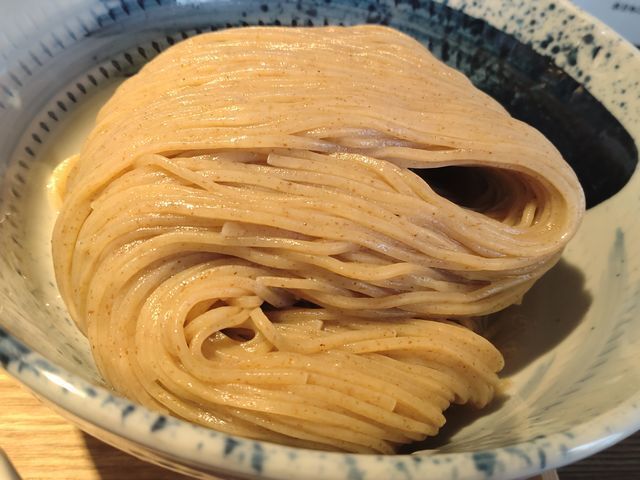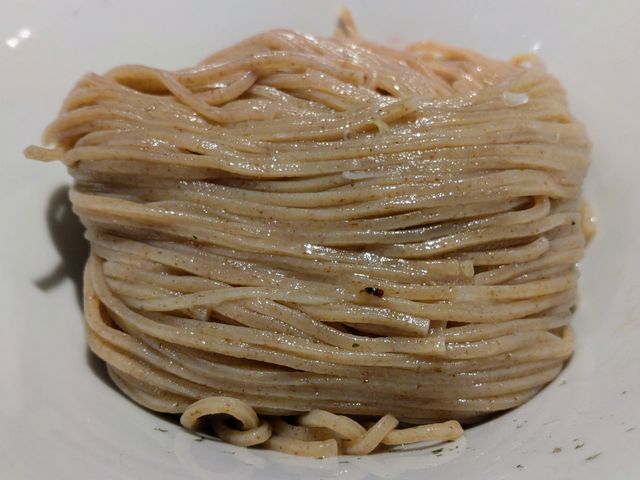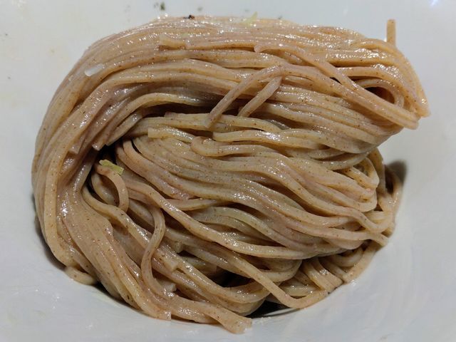 前回いただいたときは、石臼挽きと思われる全粒粉が配合されて中細ストレート麺が使われていて!
