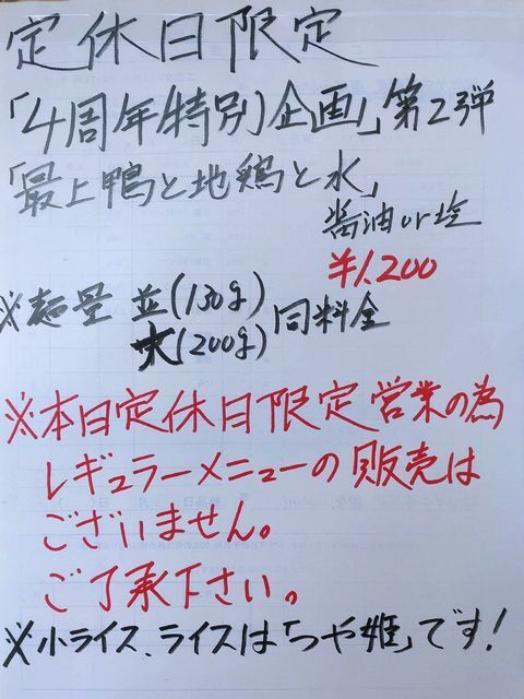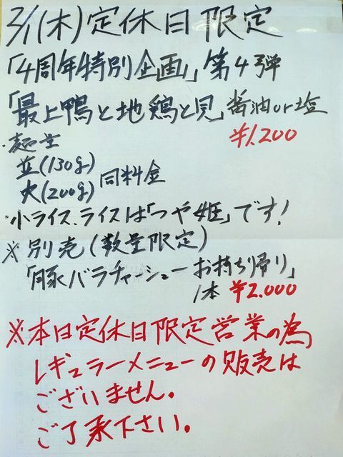 2/9(木)定休日限定メニュー:鴨もつ中華蕎麦…1100円