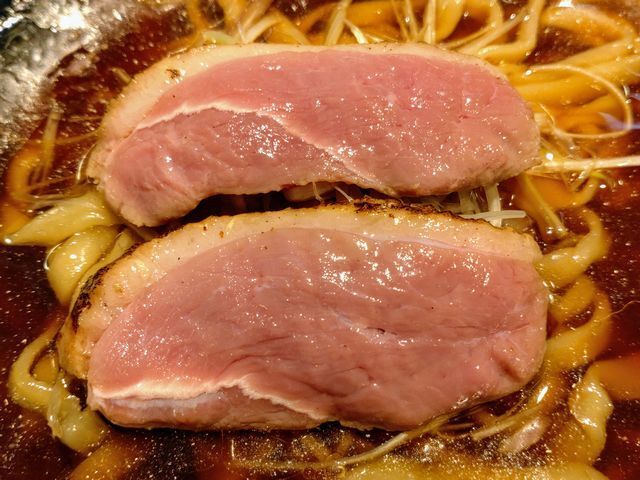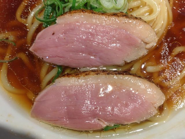 噛めば、ジューシーな鴨ムネ肉の旨みが滲み出てくるレアチャーシューで絶品