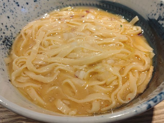 豆乳生クリーム昆布水に浸かった平打ちの太ストレート麺の上に卵黄!