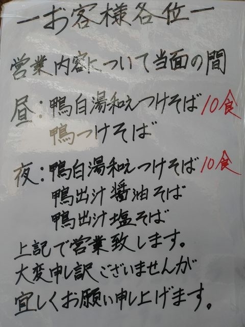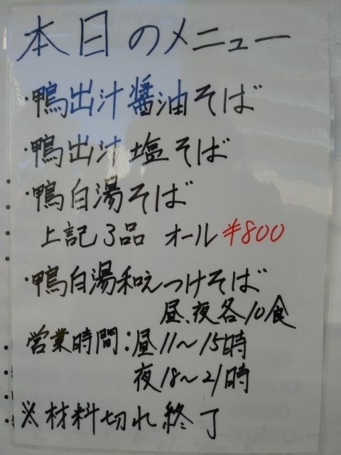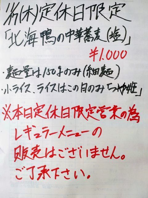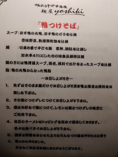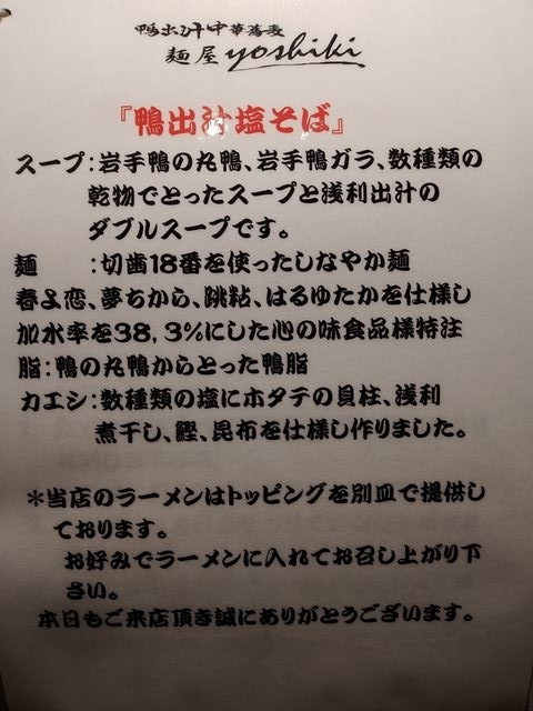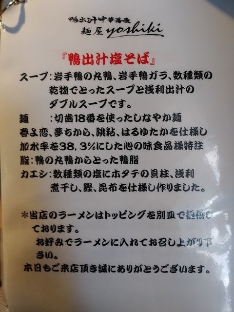 鴨出汁中華蕎麦 麺屋yoshiki【壱弐】 ~先週に続いて定休日の木曜日に定休日限定営業する店で北海道産鴨の「スノーホワイトチェリバレー」と水だけで作ったスープの「北海鴨の中華蕎麦(塩)」&「北海鴨