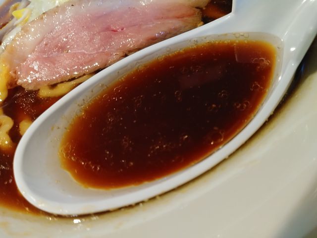 まずは、背脂が入らないように注意しながら、スープをいただくと…