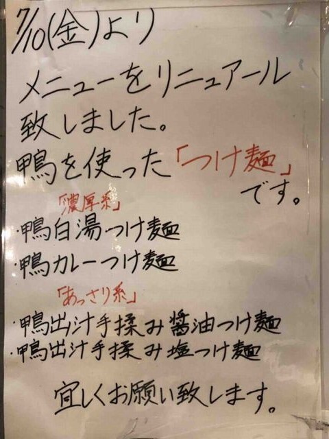 今後も、美味しい鴨出汁の「中華蕎麦」に「つけ蕎麦」を食べさせてください。