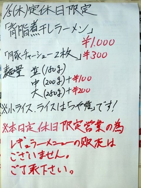 今日はレギュラーメニューの提供はなく、限定の「背脂煮干しラーメン」のみで「定休日特別営業」をするという!