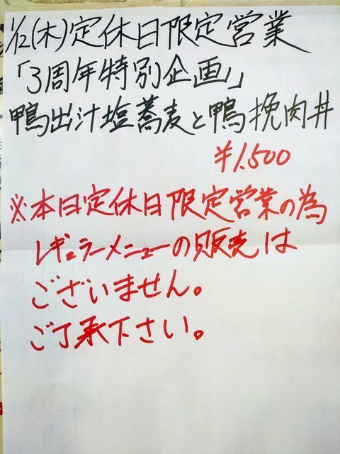 本日1月12日の本来は定休日の木曜日に「3周年特別企画」として限定メニューの「鴨出汁塩蕎麦と鴨挽肉丼」のセットが提供される『鴨出汁中華蕎麦麺屋yoshiki』へ!