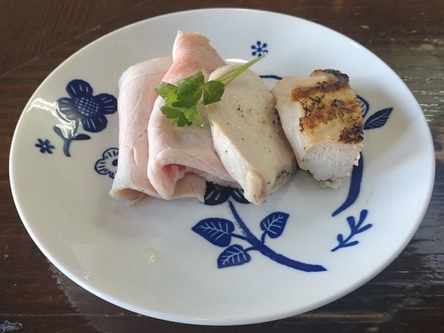 鶏ムネ肉、鶏もも肉のローストチャーシューの4種類のチャーシューが並べて盛りつけられて…
