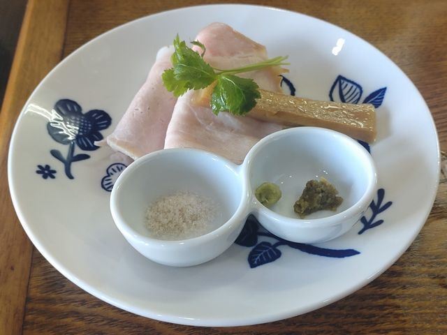 そして、トッピングの豚ロースと豚リブロースの燻製レアチャーシューに太メンマ、カイワレが盛りつけられて、小皿に入る塩と山葵と柚子胡椒が載せられた別皿と…