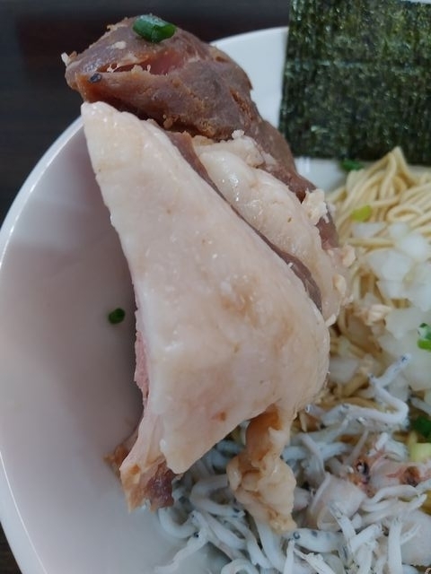 絶妙のタイミングで出された「冷やし和え玉」は、キレイに麺線を揃えて盛りつけられた冷たい麺の上に解し鶏チャーシュー、玉ネギ、小ネギがトッピングされたもので!